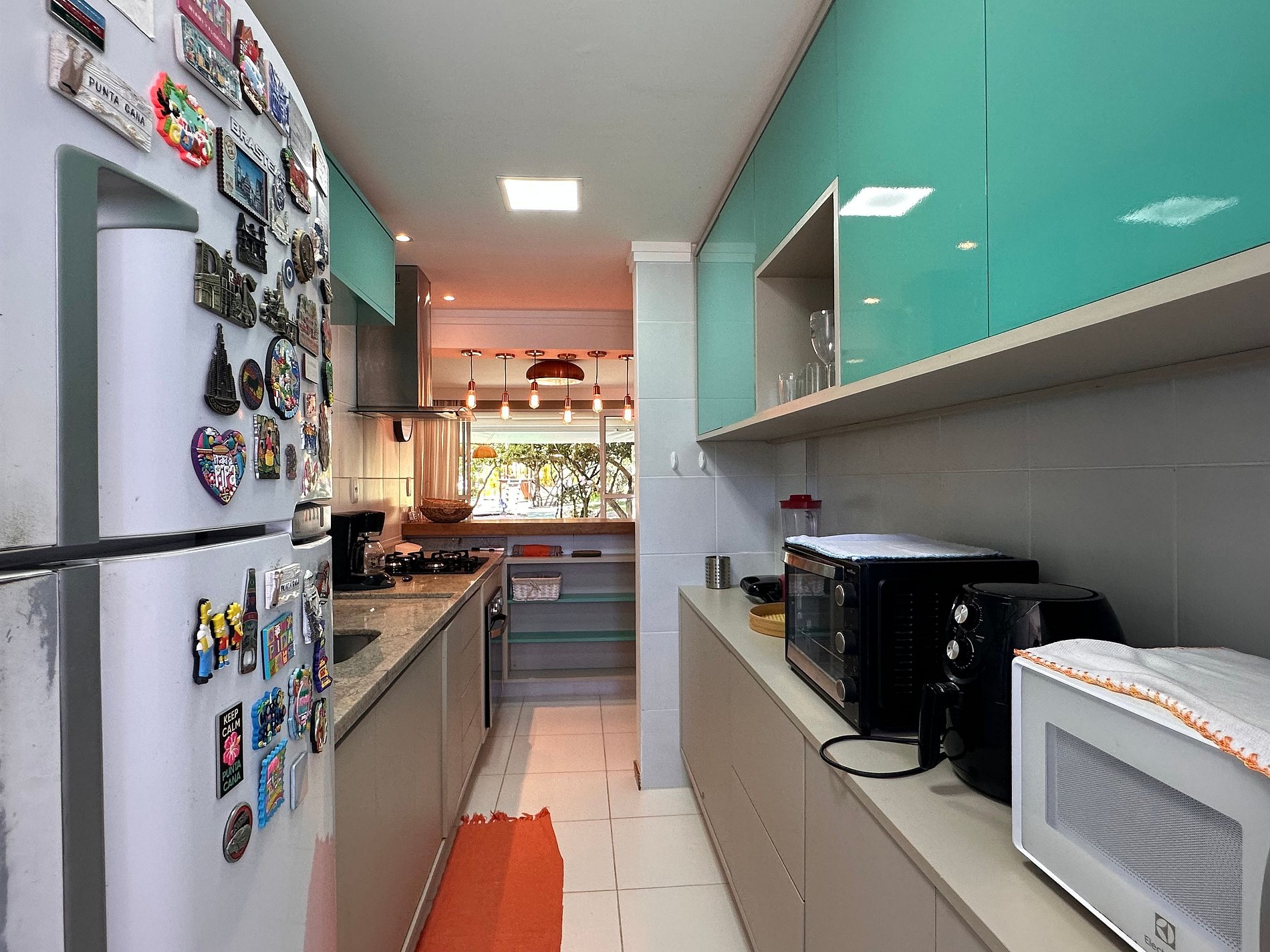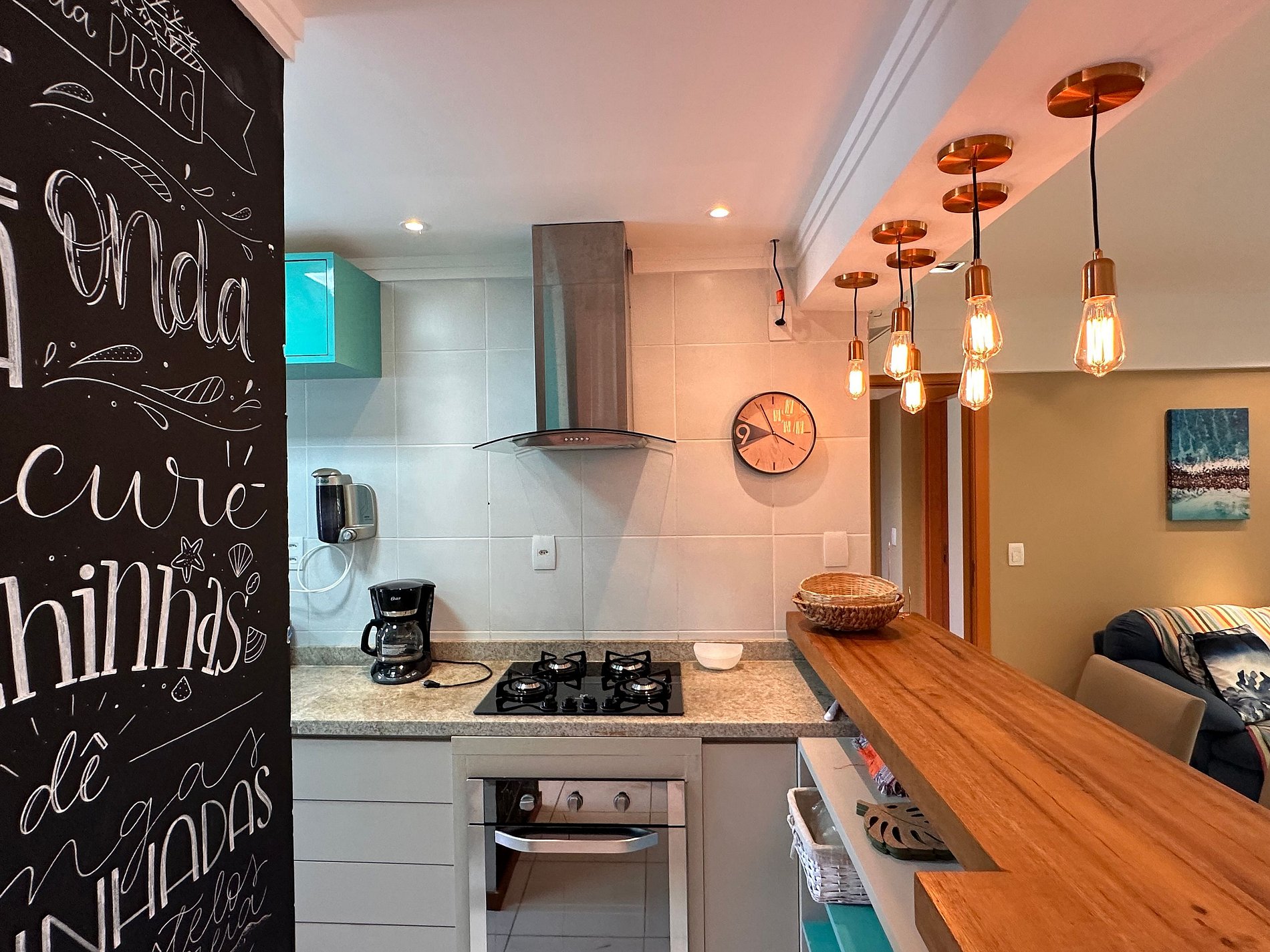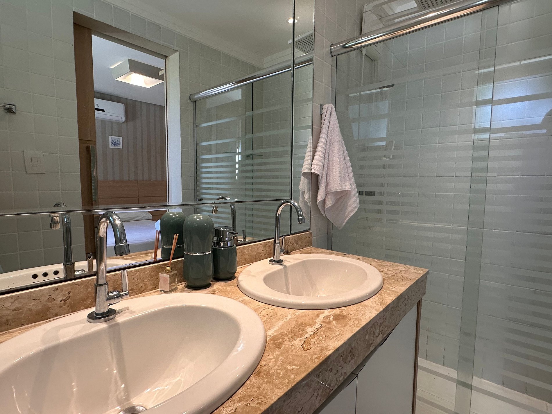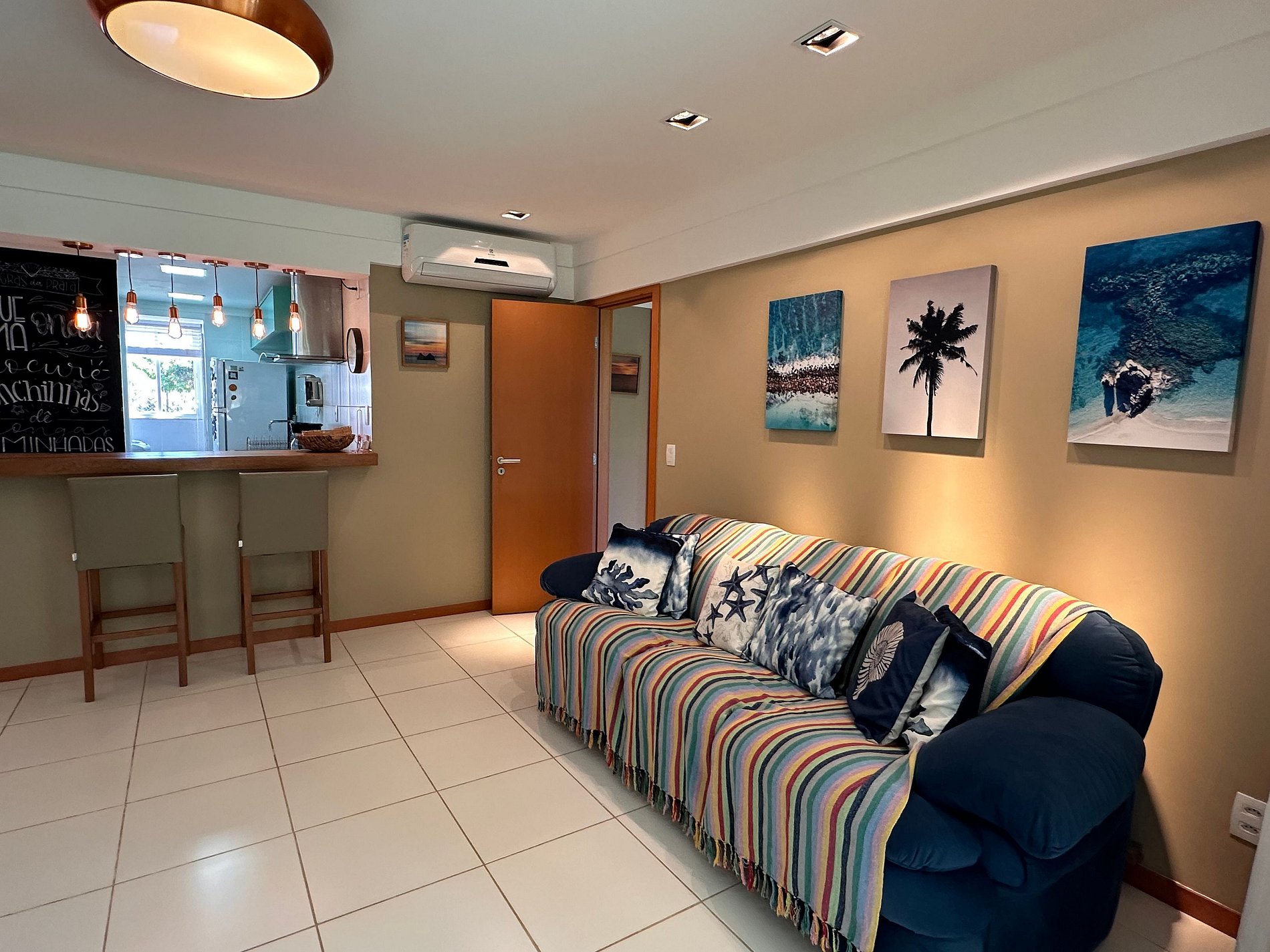 Apartamento que consta de 1 suite con aire acondicionado, 1 dormitorio con aire acondicionado, baño social, cocina totalmente equipada, sala de estar con aire acondicionado y balcón gourmet con barbacoa.
